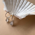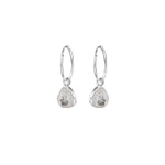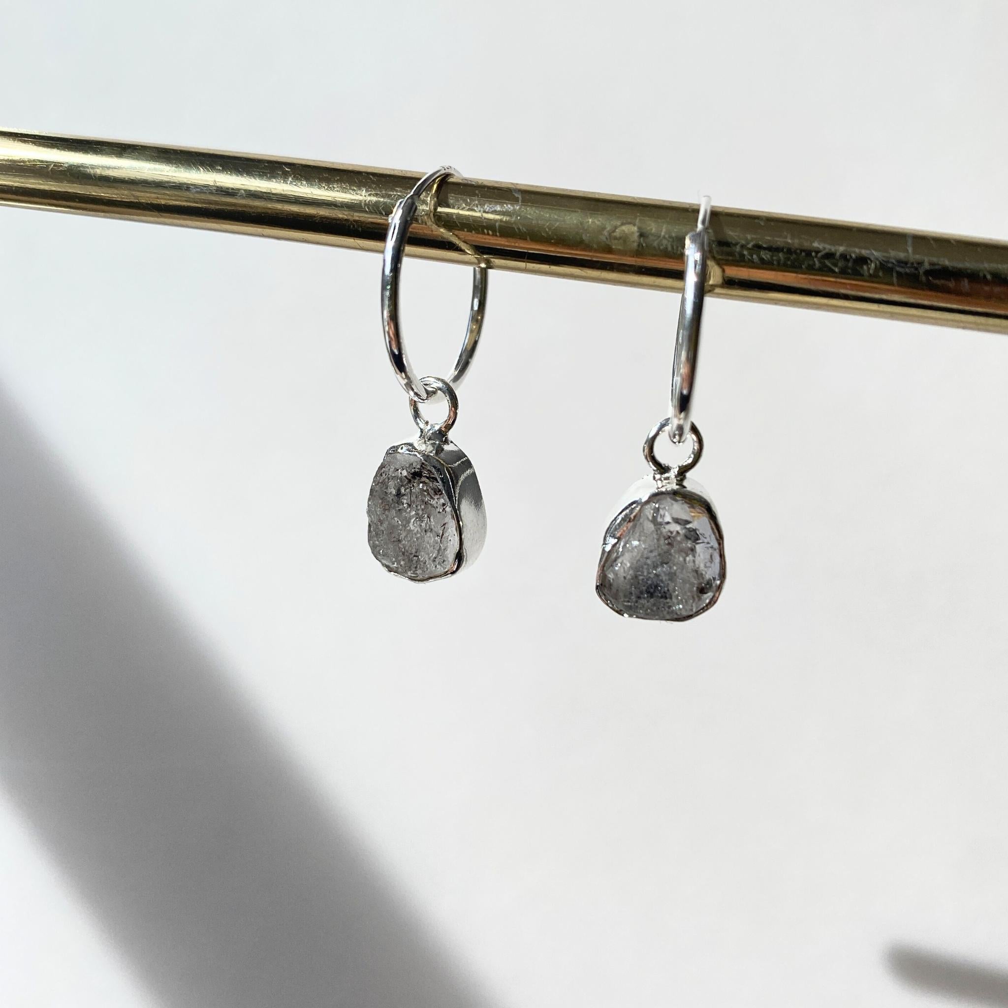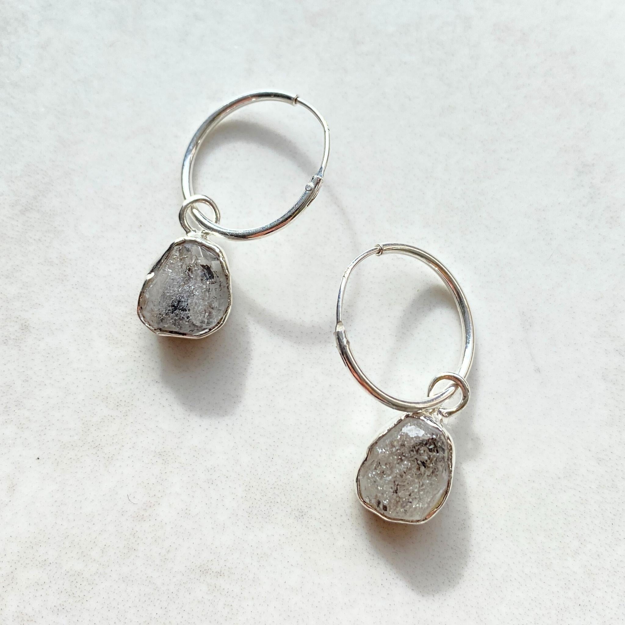 A pair of organic-shaped Herkimer Diamond carved stones hand-set in sterling silver and suspended on sterling silver hoop earrings.