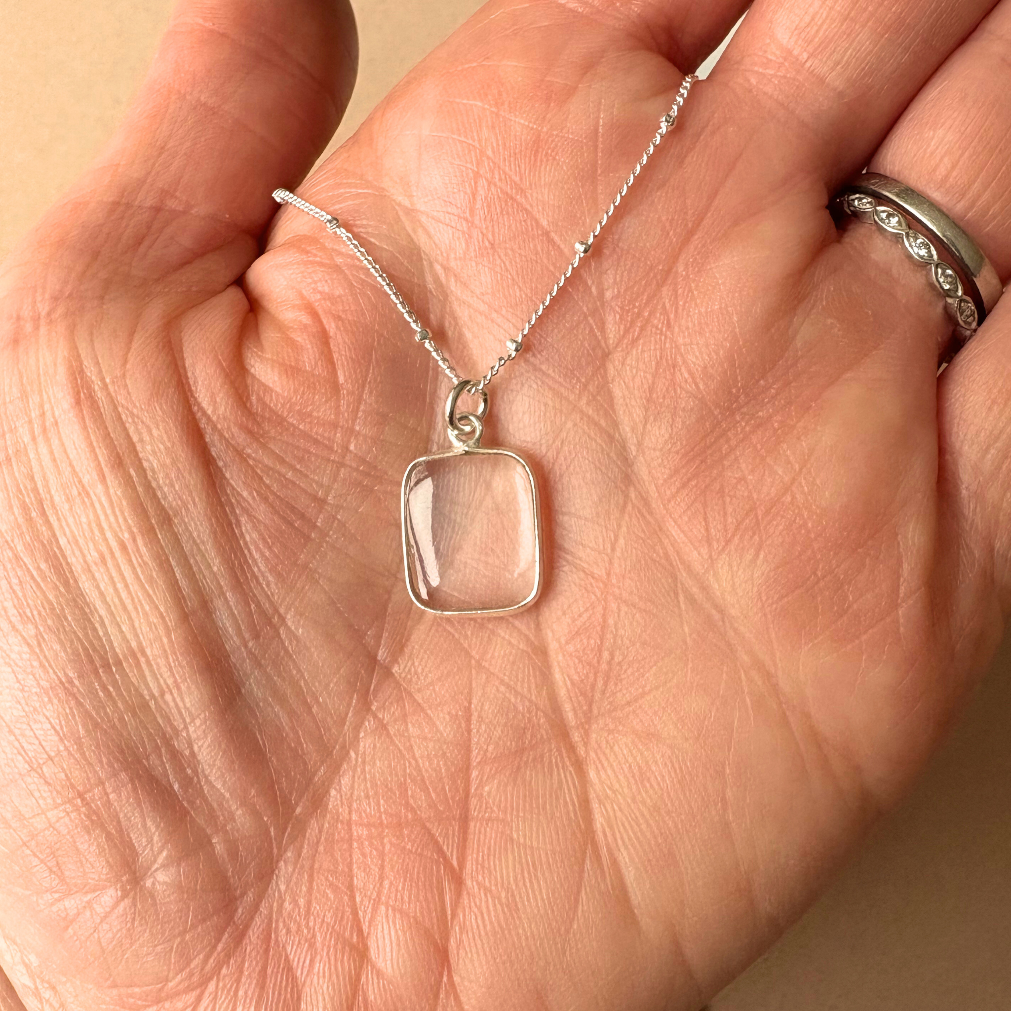 A delicate gem slice of Quartz, edged in silver and suspended on a delicate satellite chain.