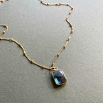 A delicate, organic-shaped, slice of Labradorite, edged in gold plating and suspended on a delicate satellite chain.