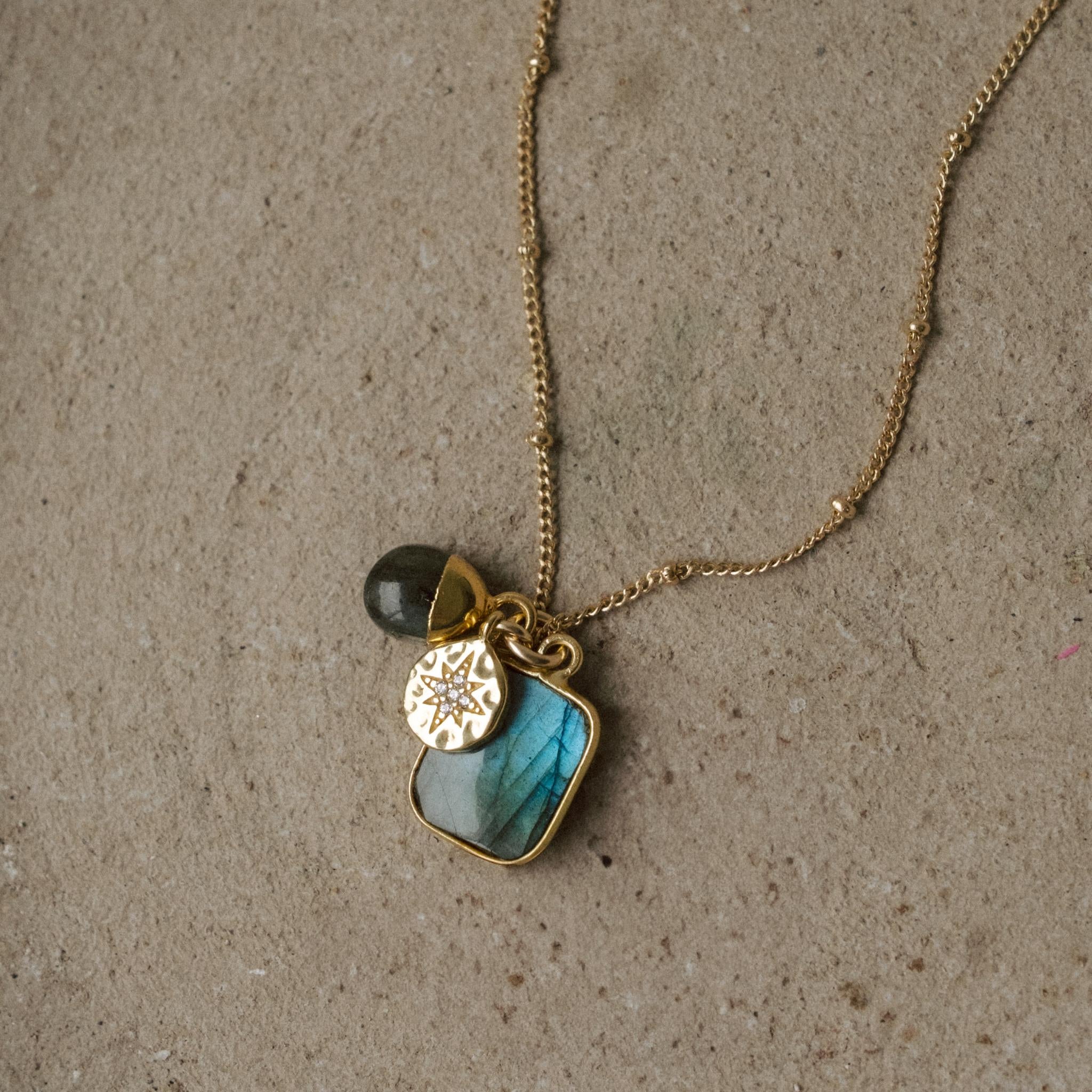 A handmade Labradorite gemstone necklace featuring three delicate charms on a gold plated satellite chain. Designed for everyday wear, this unique piece combines natural texture with subtle shine.