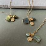 Each necklace includes a hand-carved Labradorite slice, a polished tumbled stone, and a hammered coin charm creating a layered, modern look.