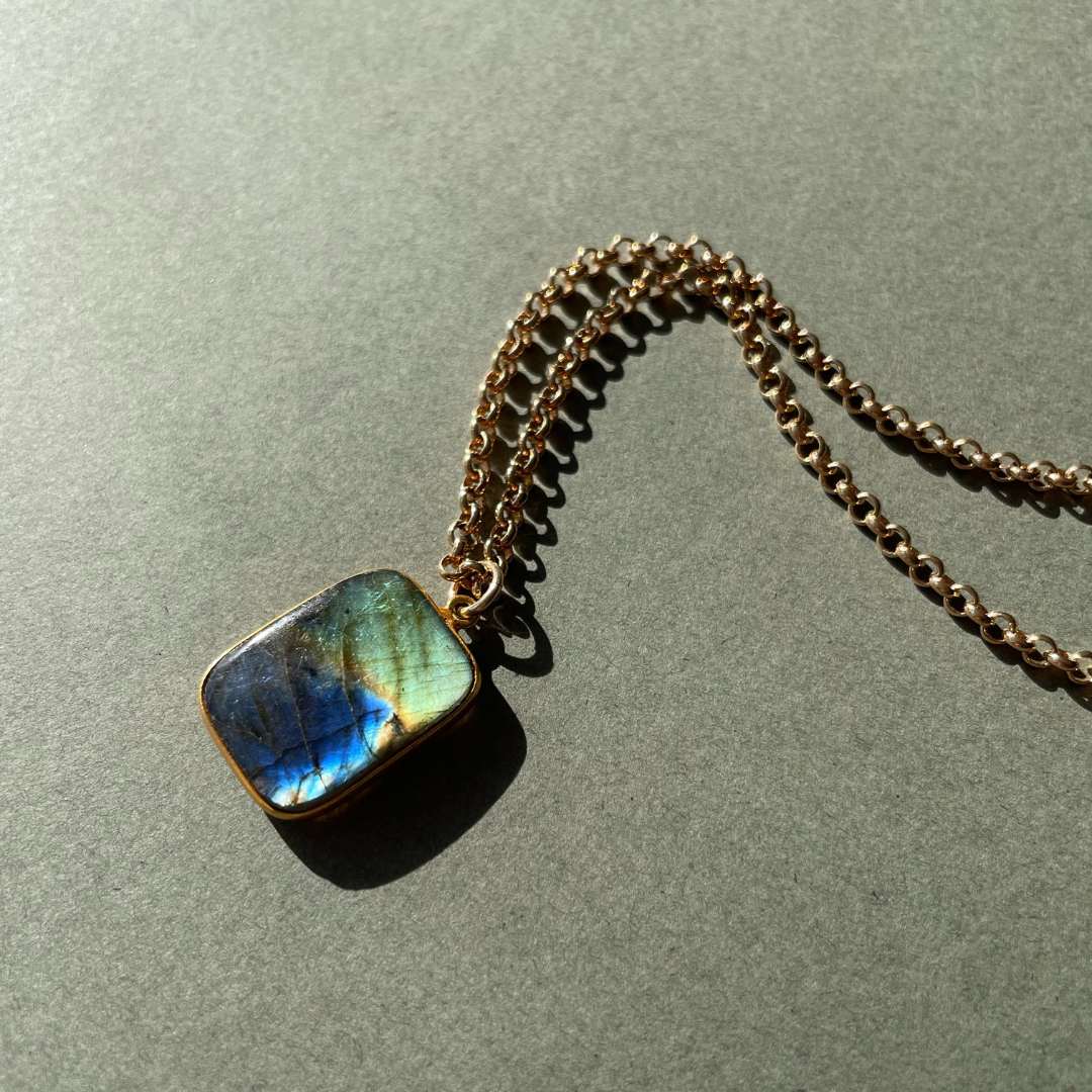 A large organic gem slice of Labradorite edged in gold plating and suspended on a belcher chain.
