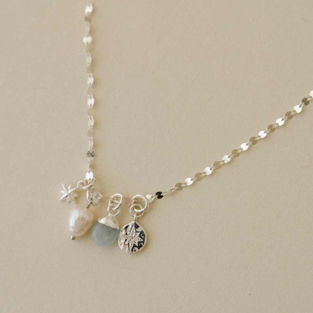 A Limited Edition charm necklace including a Pearl and natural Aquamarine stone.