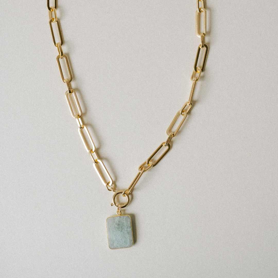 A large slice of Aquamarine edged in gold and suspended on a statement chunky link chain with a large bolt ring clasp.