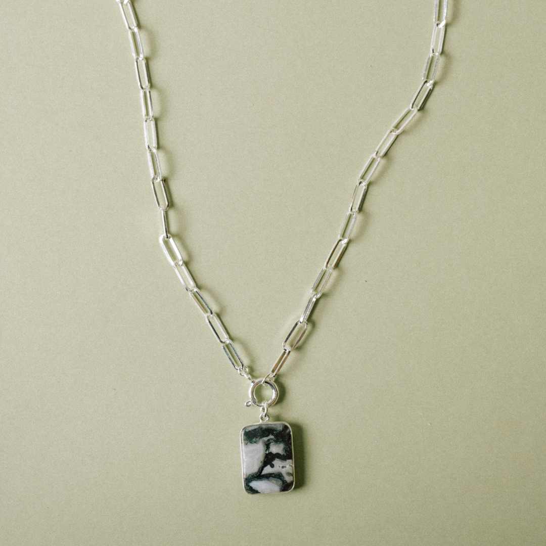 A large Moss Agate gem slice in silver suspended on a chunky link chain with a large bolt ring.