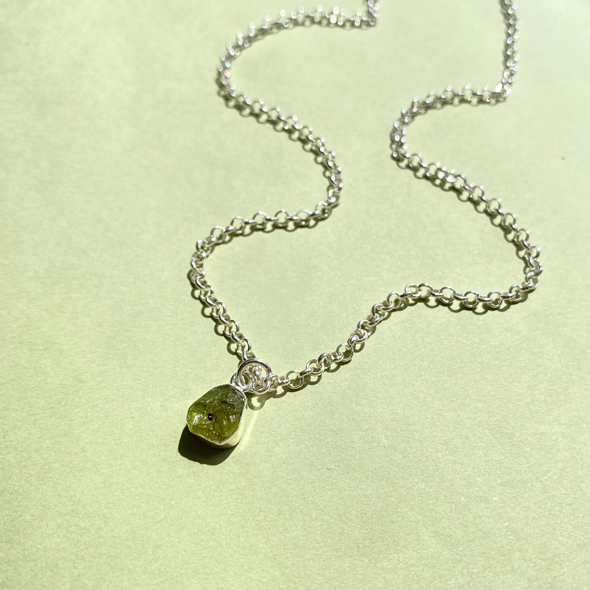 An organic-shaped Peridot stone hand set in sterling silver. The pendant is suspended on a chunky belcher chain.